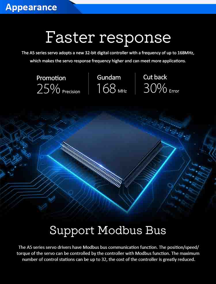 2.Admite 7 modos de control: posición, velocidad, par, posición/par, posición/velocidad, velocidad/par y posición/velocidad/par.